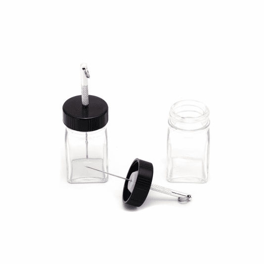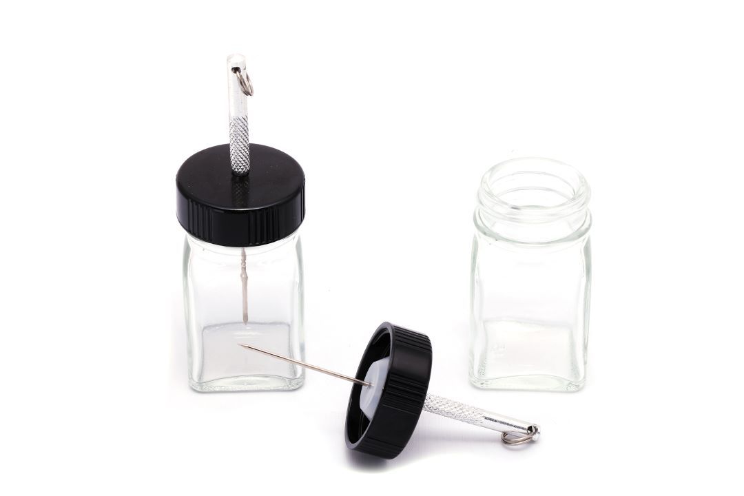 This Empty Glass Jar with Applicator Cap Bodkin is a 1oz, wide mouth bottle that comes with a dubbing needle cap for precise application. It can be used for any cement or fly tying adhesive. The bottle fits perfectly in the Foamanizer Glue Station.