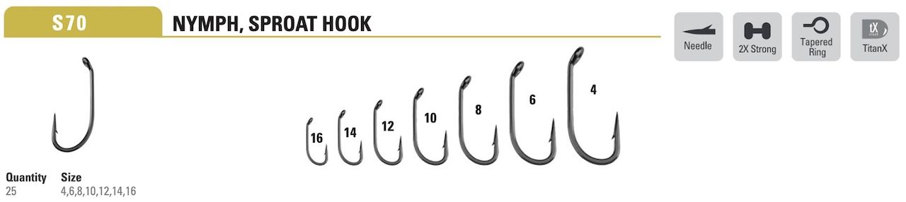 The Mustad S70 nymph/wet fly hook is the modern equivalent of the classic 3399 or 3399A hook. This wicked sproat bend 2x heavy hook stays solid in a fish as good as any hook every created.