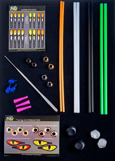 The ProSportfisher Predator Tube Fly Tying Kit includes the following items: 1 XL Predator Pro Flexineedle, 1 black, 1 clear, 1 Fluo Orange, 1 fluo green XL Predator Tube, 2 each- gunsmoke metallic, silver, gold Pro Predator Coneheads, 2 Pro Soft Heads 10mm in clear, 2 Pro Soft Heads in 12mm Black, 1 sheet of Pro jungle cock synthetic eyes Large and XL 4 eyes each, 2 Pro Cool eyes in 10mm, 2 Pro cool eyes in 12mm, and 4 Pro Attitude Eyes.