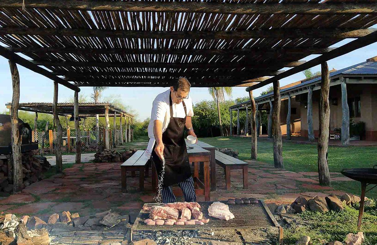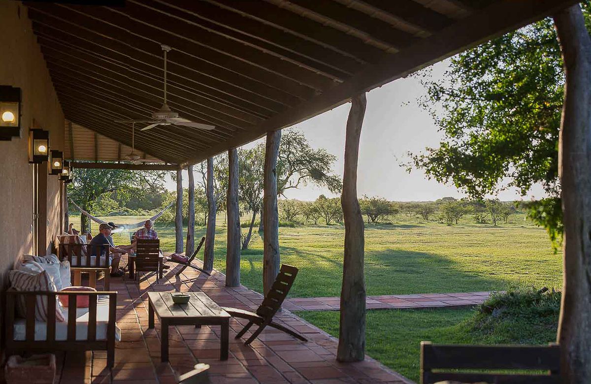 - A: Guests stay in air-conditioned rooms with private baths, with a main lodge featuring shared living, dining, and bar areas designed in traditional Corrientes style.